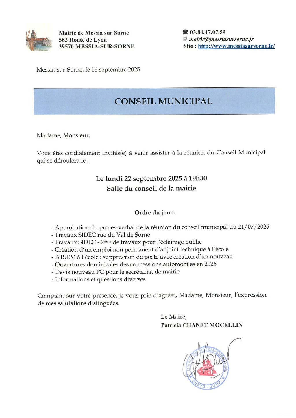 La prochaine réunion du conseil municipal aura lieu ce lundi 22 septembre 2025 à 19 h 30 à la salle du conseil.