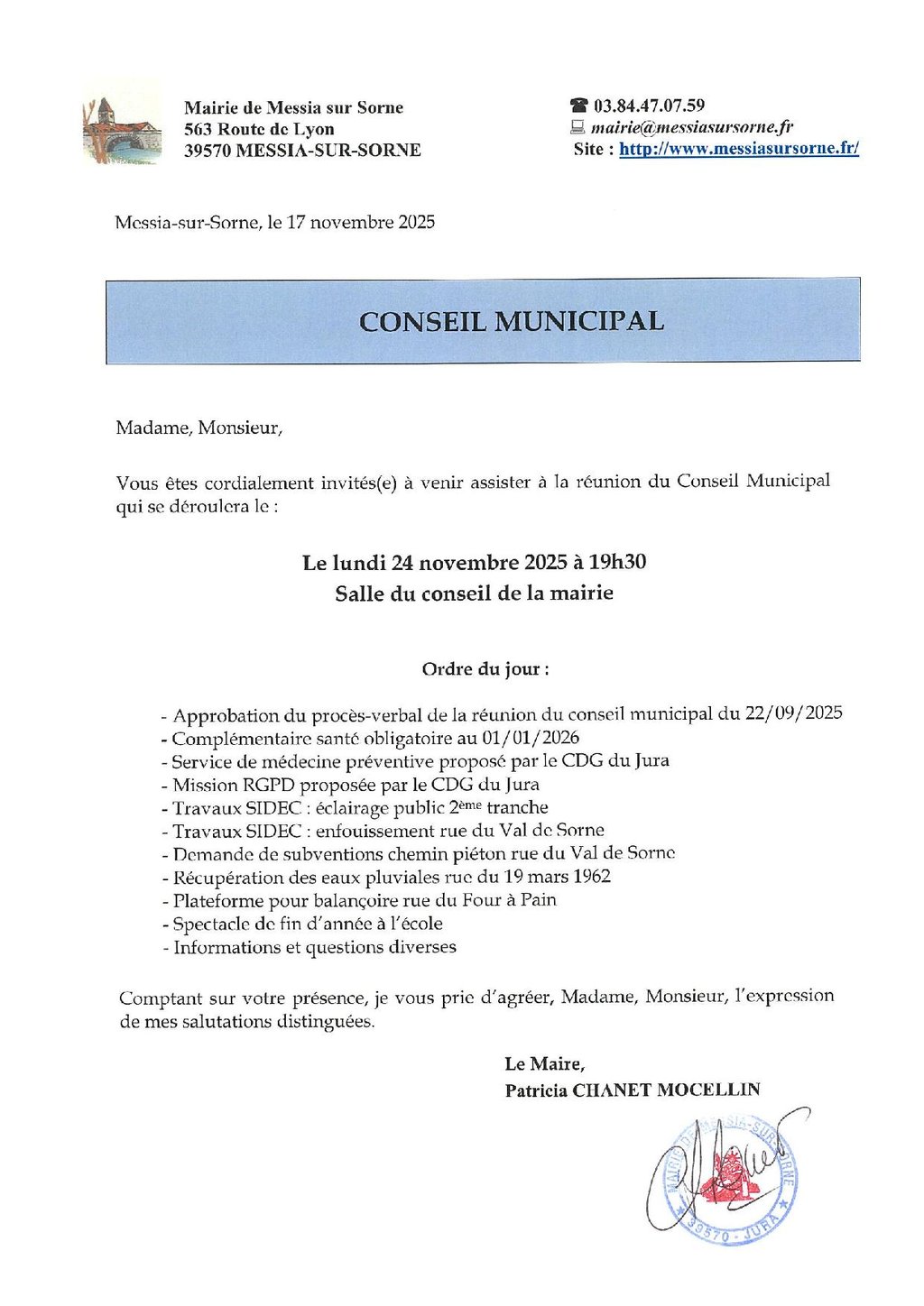 CONVOCATION RÉUNION DU CONSEIL MUNICIPAL LUNDI 24 NOVEMBRE 2025 À 19H30