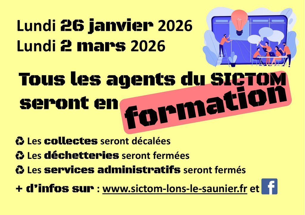 Nous vous informons que TOUS les agents du SICTOM de la zone de Lons seront en formation les lundis 26 janvier et 2 mars 2026.